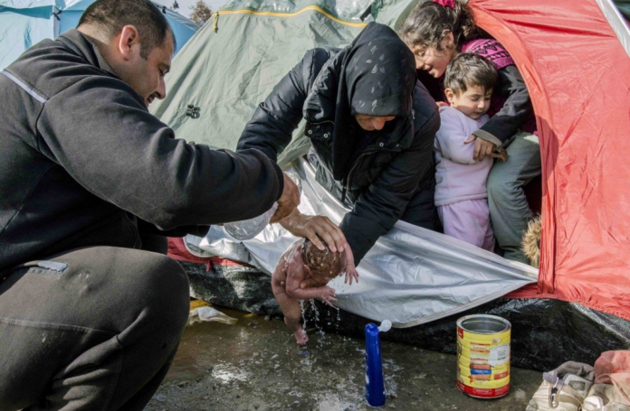 Η νεαρή πρόσφυγας έφερε αβοήθητη στον κόσμο το παιδί της όχι πάνω σε κάποιο κρεβάτι ή με όλες τις ανέσεις που γνωρίζουμε. Γέννησε πρωτόγονα πάνω στο μουσαμά μιας σκηνής μέσα στις λάσπες.