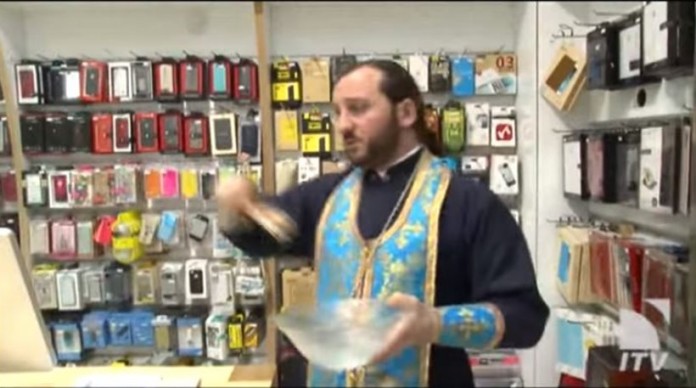 Ο ιδιότυπος αυτός ηλεκτρονικός αγιασμός, ο οποίος καταγράφηκε και σε βίντεο, έγινε στην πρωτεύουσα της Γεωργίας την Τυφλίδα, όπου ένα κατάστημα είχε ξεμείνει με αρκετά στοκαρισμένα iPhone 5s και δεν μπορούσε να απαλλαγεί από αυτά.